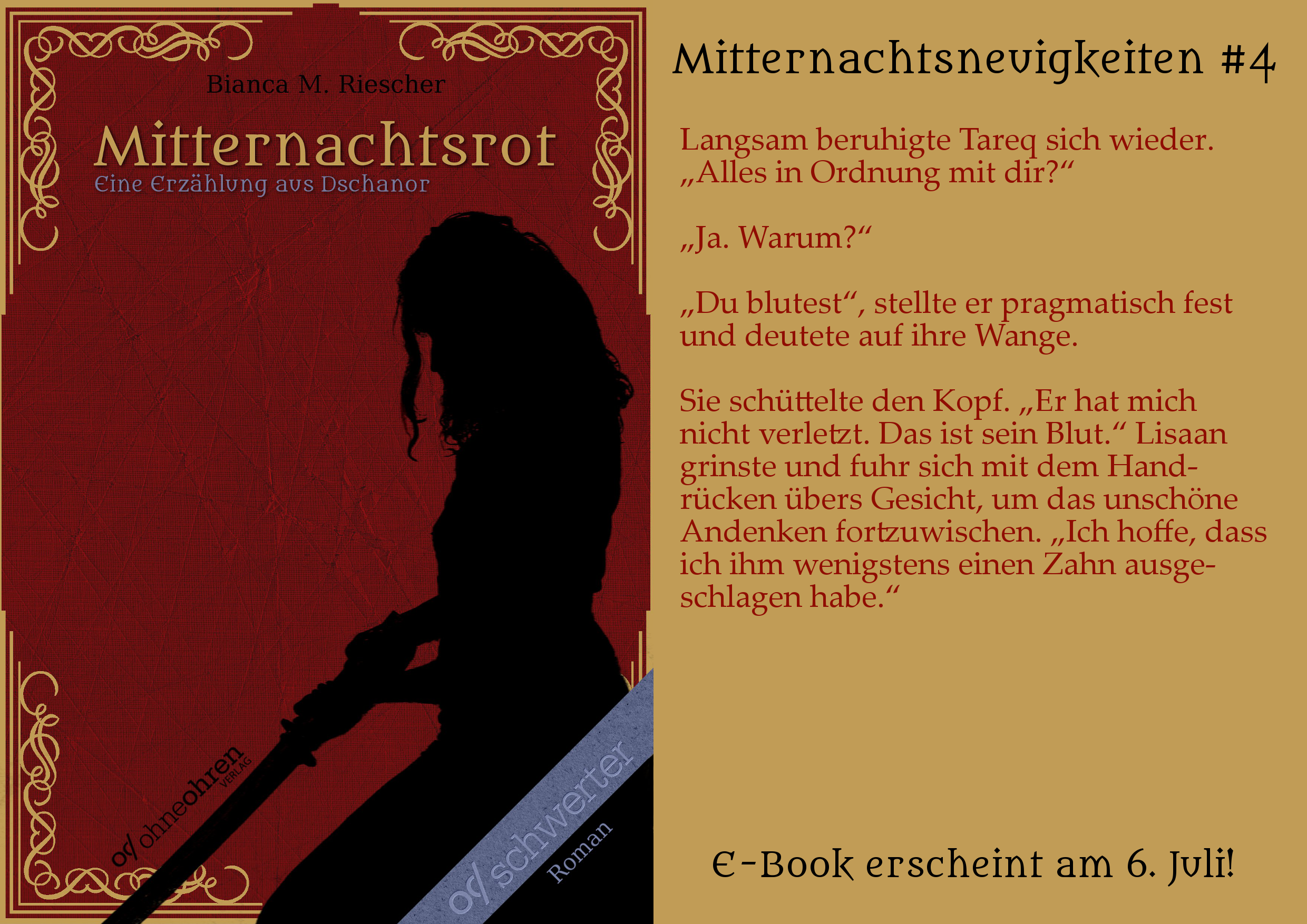 Hier also noch der letzte Teaser zu Mitternachtsrot und das Warten geht in die nächste Runde … natürlich in die Leserunde, die es bald geben wird (wann genau es losgeht, werde ich noch mitteilen). Und selbstverständlich bin ich extrem neugierig wie die Rückmeldungen zu meinem Debütroman ausfallen werden.