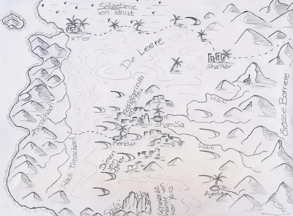 Was man auf den Skizzen jetzt nur bei Nummer 1 am rechten Rande in kleines bisschen sieht, aber (für mich als Geographin) doch recht wichtig ist: Ich zeichne meistens noch einen Maßstabsbalken ein, damit ich die Entfernung auch richtig abschätzen kann und ich meine Protagonisten nicht aus Versehen 200 km am Tag reiten lasse (und damit die armen Pferde bzw. Kamele überfordere). So ein Balken ist auch recht praktisch, wenn ich die Karte einscanne und dabei vergrößere oder verkleinere, kann ich die Strecken trotzdem leicht abmessen, ohne den Maßstab (sofort) umrechnen zu müssen.