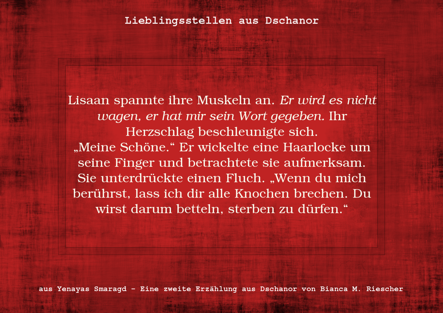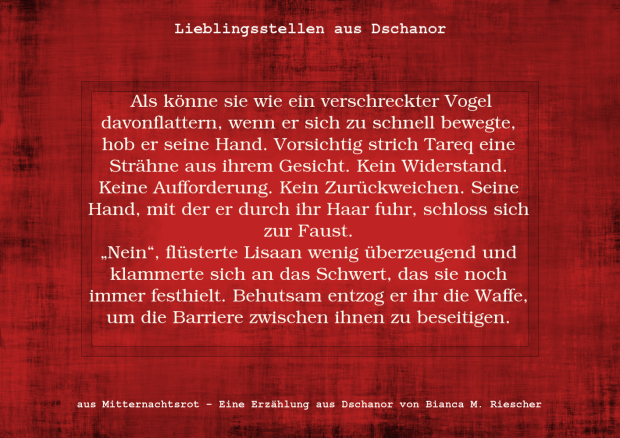 Daher möchte diesen Tag mit zwei Textstellen feiern, denn es gibt in meinen Romanen neben Schwert- und Bogenkämpfen ja auch ein paar romantische Begegnungen, in denen sich meine beiden Helden Tareq und Lisaan vielleicht küssen oder vielleicht auch nicht. Wie es tatsächlich weitergeht, wird nicht verraten.