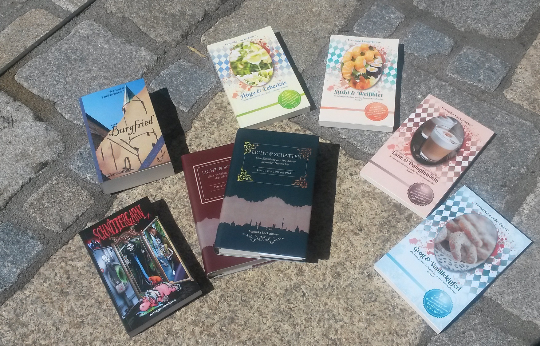 Geschrieben habe ich schon … mein Debüt „Burgfried“ (2014), vier Regional-Krimis der „Hugo & Leberkäs“-Reihe (2016/2017), den historischen Zweiteiler „Licht und Schatten“ über das 20. Jahrhundert (2017), meinen Roman „Bacchus‘ Vermächtnis“ (2018), eine Dystopie (2019) und zahlreiche Kurzgeschichten.