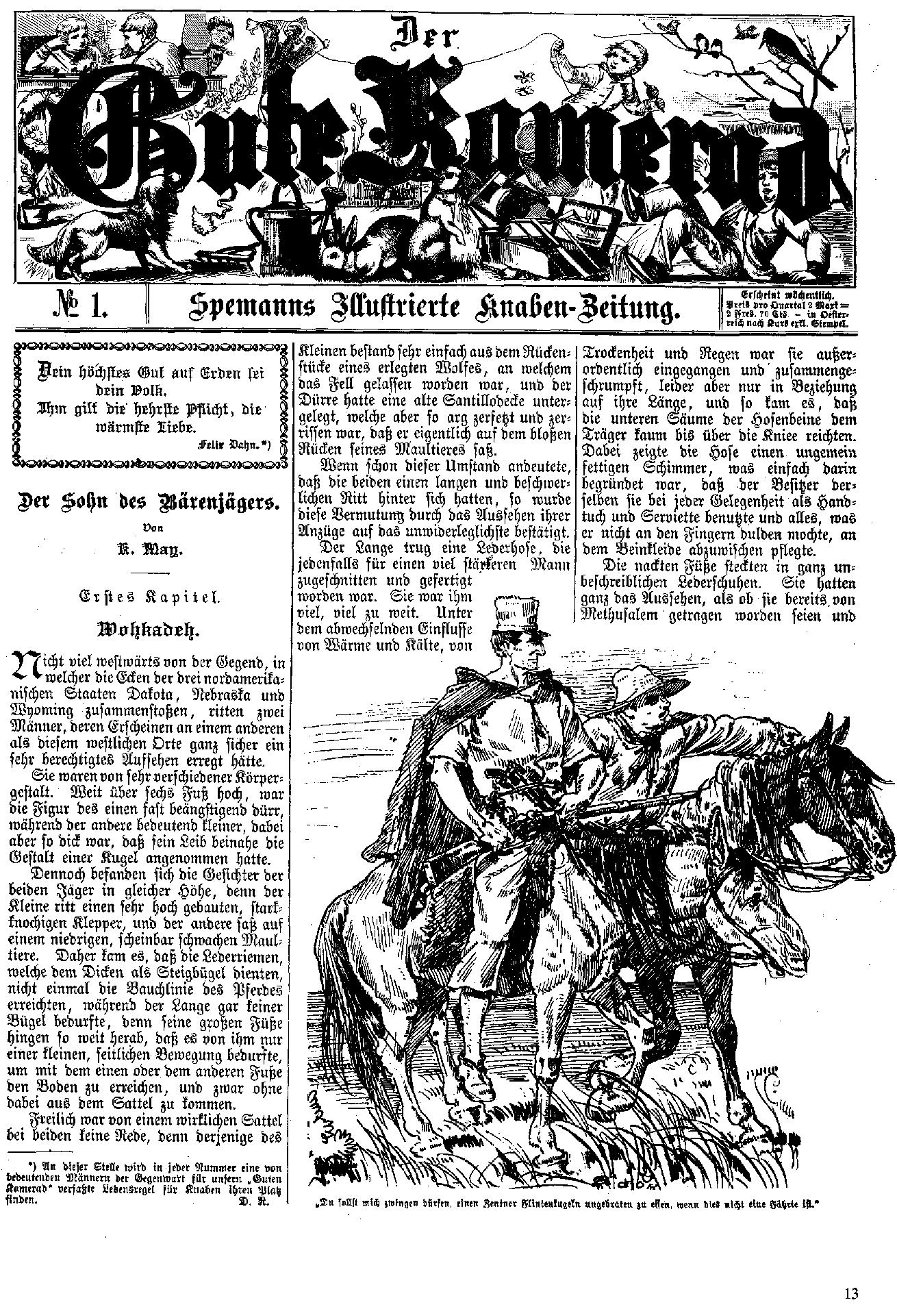 Zu diesem Zeitpunkt war Karl May 30 Jahre alt (er wurde am 25.02.1842 geboren – zwar nicht am 1. März, aber nah genug dran) und hat natürlich auch eine seiner Geschichten im Yellowstone Nationalpark spielen lassen: Der Sohn des Bärenjägers (erstmals erschienen 1887 in der Zeitschrift „Der gute Kamerad“). Der Sohn des Bärenjägers war meine erste Karl-May-Geschichte, die ich vor mehr als 35 Jahren gelesen habe.