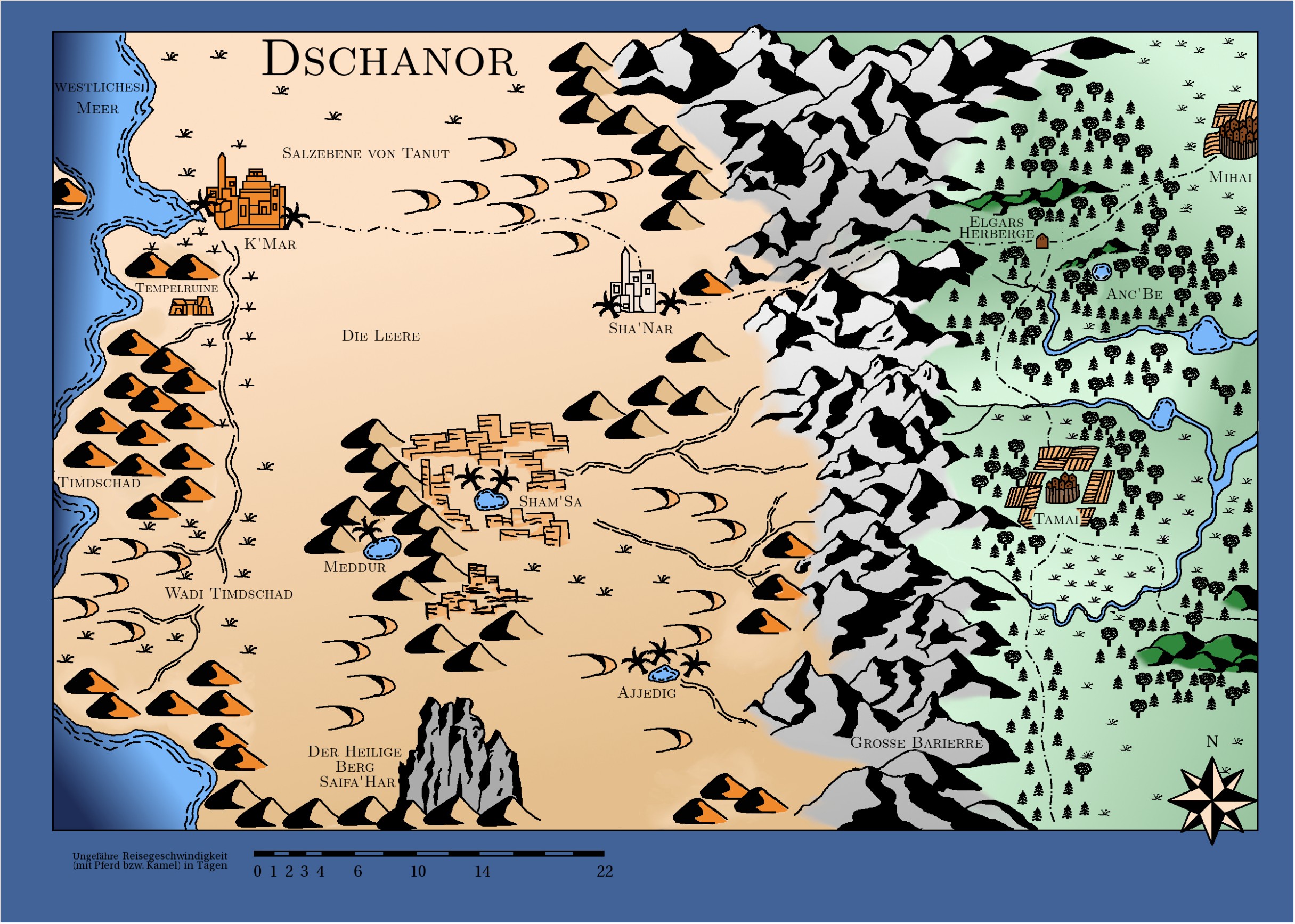 Für diejenigen, die Dschanor noch nicht kennen, möchte ich ein paar Hinweise geben, wohin die Reise von Lisaan und Tareq in „Schwert und Smaragd“ geht. Dafür ist bestimmt diese kleine Karte hilfreich, die mit jeder weiteren Geschichte aus Dschanor grösser geworden ist.