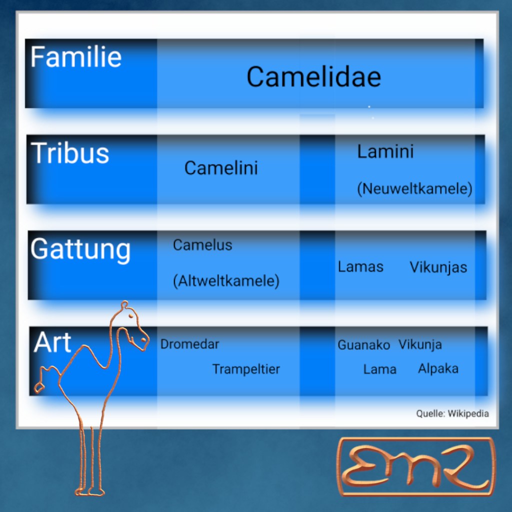 Die etwas längere Version: Die Säugetier-Familie der Kamele (Camelidae) teil sich zunächst einmal grob in die zwei Gruppen der Altweltkamele und der Neuweltkamele auf. Zur Gattung der Altweltkamele zählen die Dromedare (1 Höcker) und die Trampeltiere (2 Höcker). Die Neuweltkamele umfasst die Gattungen der Lamas und der Vikunjas (keine Höcker).