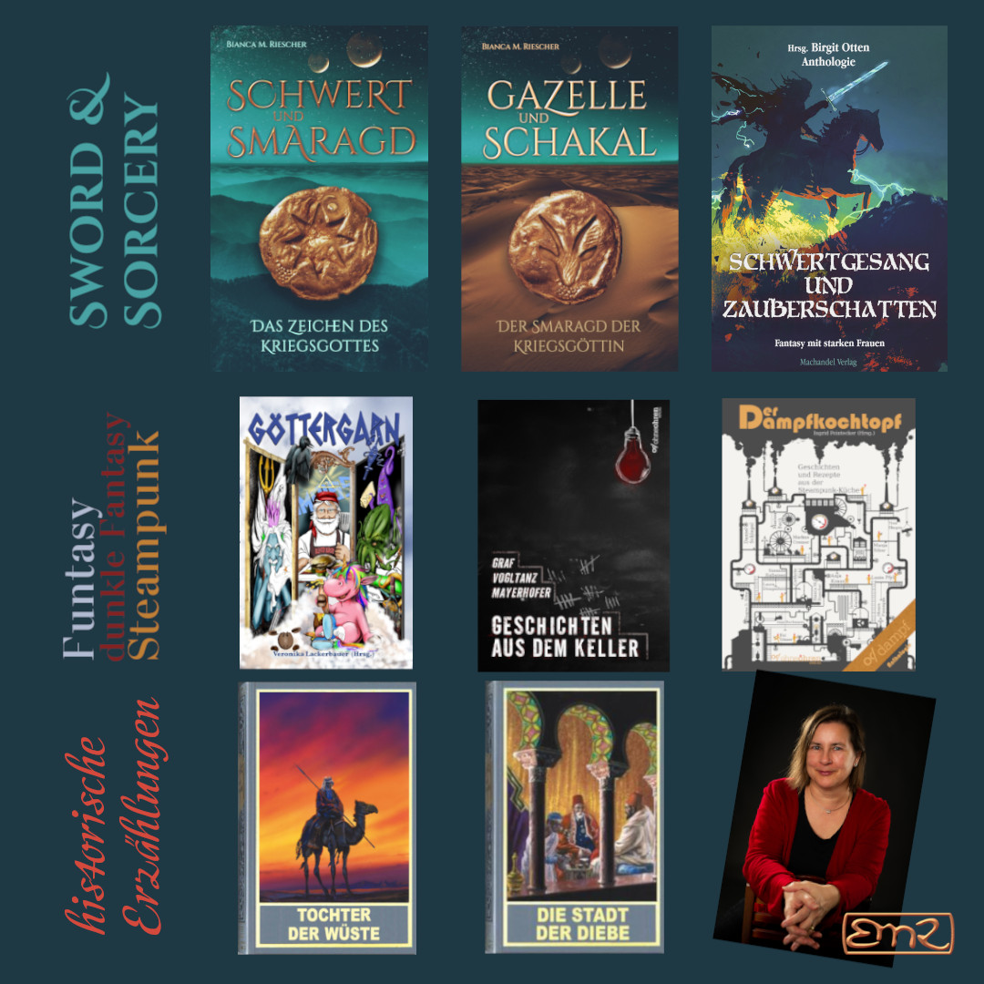 Da kommt doch mittlerweile so einiges zusammen (mehr als ich im ersten Moment gedacht habe) seit meiner ersten Veröffentlichung vor zehn Jahren. Neben meinen Sword- & Sorcery-Romanen wie dem zuletzt erschienenen Gazelle und Schakal, in denen ich meine Helden gerne mal in die Wüste schicke und sie Abenteuer erleben lasse, gibt es ja noch ein ganzes Rudel Kurzgeschichten. Und zwar aus ziemlich verschiedenen Genres (wobei die vier Kurzgeschichten, die in den beiden Anthologien Die Stadt der Diebe und Tochter der Wüste aus dem Karl May Verlag nicht phantastisch, sondern historisch daher kommen), wie hier zu sehen ist: